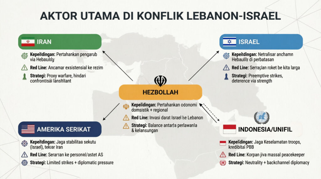 • Lebanon sebagai “pressure valve”: Baik Iran maupun Israel punya kepentingan menjaga konflik tetap “terkelola” — perang total merugikan semua pihak.